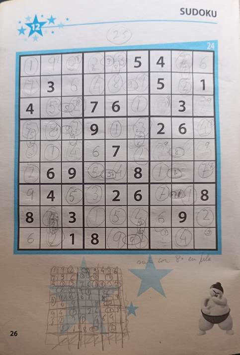 Era habitual encontrar a mi padre sentado en el sillón con su portaminas, nunca utilizaba lápiz, y su goma de borrar intentando alcanzar la resolución de esas cuadrículas de 9×9. Utilizaba diferentes técnicas para ayudar a su memoria a resolver los sudokus. A veces tomaba pequeñas notas con lápiz al pie de página.